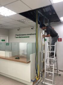- Instalações Elétricas: Redimensionamento do quadro de energia para suportar os novos equipamentos, garantindo que não haja quedas de disjuntores durante o expediente bancário.